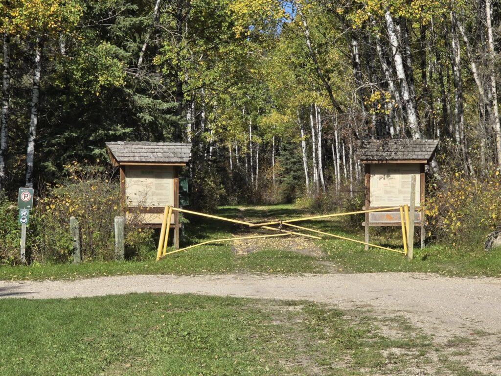 The nice thing about starting our hike on the Central Trail at the Central Trail Trailhead is its proximity to the bison enclosure. You could skip the enclosure and drive a little further from Audy Lake to reach the turnoff to the trail, but why not drive through the bison enclosure and see the bison first? Turn off at the enclosure and drive through. Along the way, you will reach a T-intersection. Turning right will take you back toward Wasagaming, while turning left leads to the bison viewing platform. The Central Trail Trailhead is just a little past the platform up another dirt road.