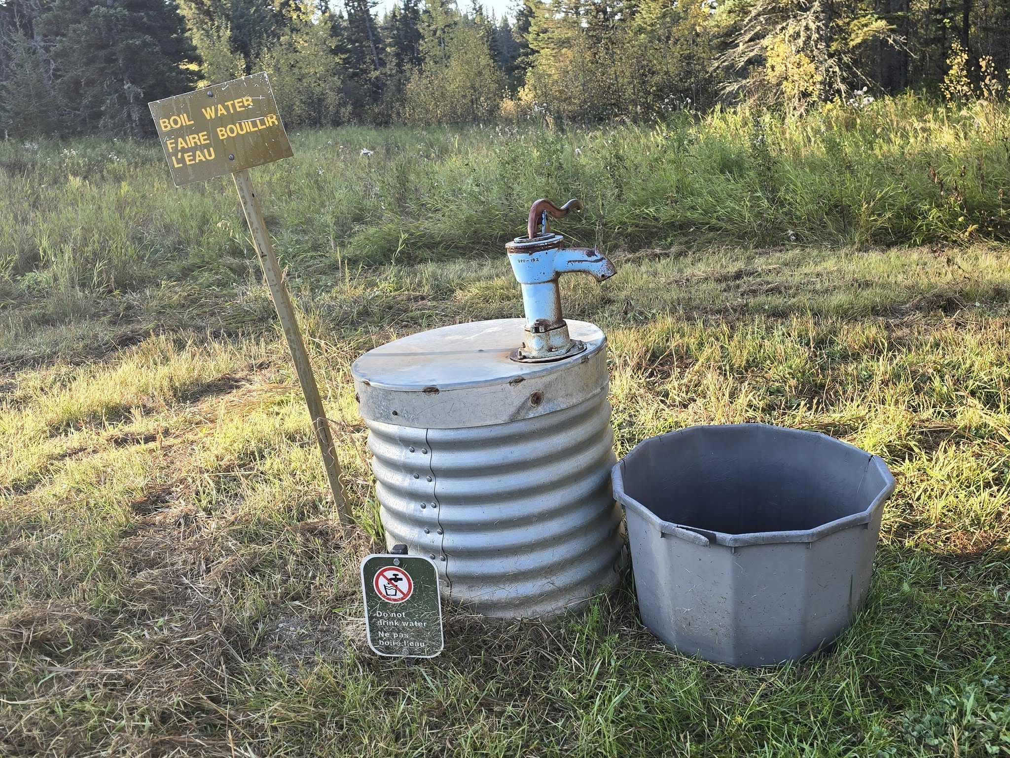 Water Pump: Some logbook comments mention that the water pump can be difficult to locate when the grass isn’t maintained. To be helpful, we documented its location in our video. Basically, stand behind the firewood shelter and face the small aspen to the right of the World War II signs. Stay between a few short aspens and head toward the cluster of trees down a slight decline. The pump will be near the trees, close to a small remnant of an old building foundation.